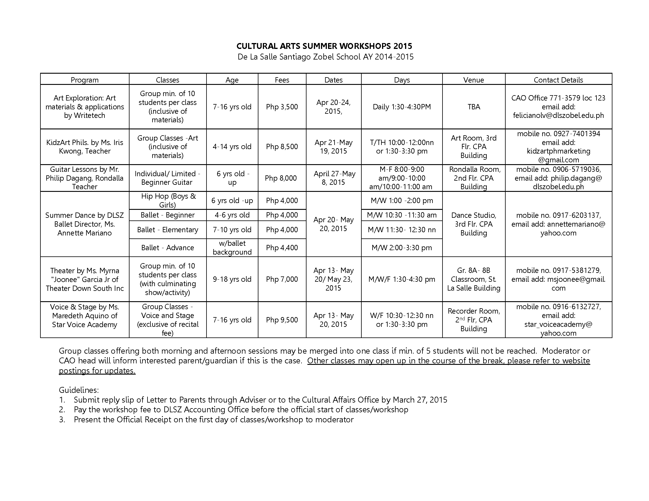 We would like to invite your child to join our dance, theater, voice and art workshops which aim to develop the creative process and artistic expression of the learner through various art forms. Other classes may have a min. number of students required per class, as such please return the Reply Slip (from Letter to Parents dated March 16, 2015) to the Cultural Affairs Office or contact the moderators directly to enlist on or before Apr 10, 2015.