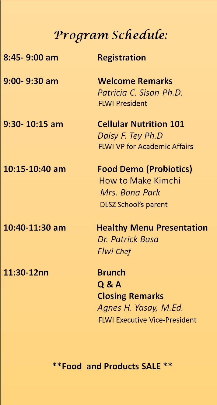 The Family Life and Wellness Institute (FLWI) invites DLSZ parents/guardians and Lasallian Partners to “Health and Nutrition Challenges of Today” on Saturday, July 25, 2015 at the Center for Lasallian Formation (CLF) Hall from 8:30 am to 12:00 nn.