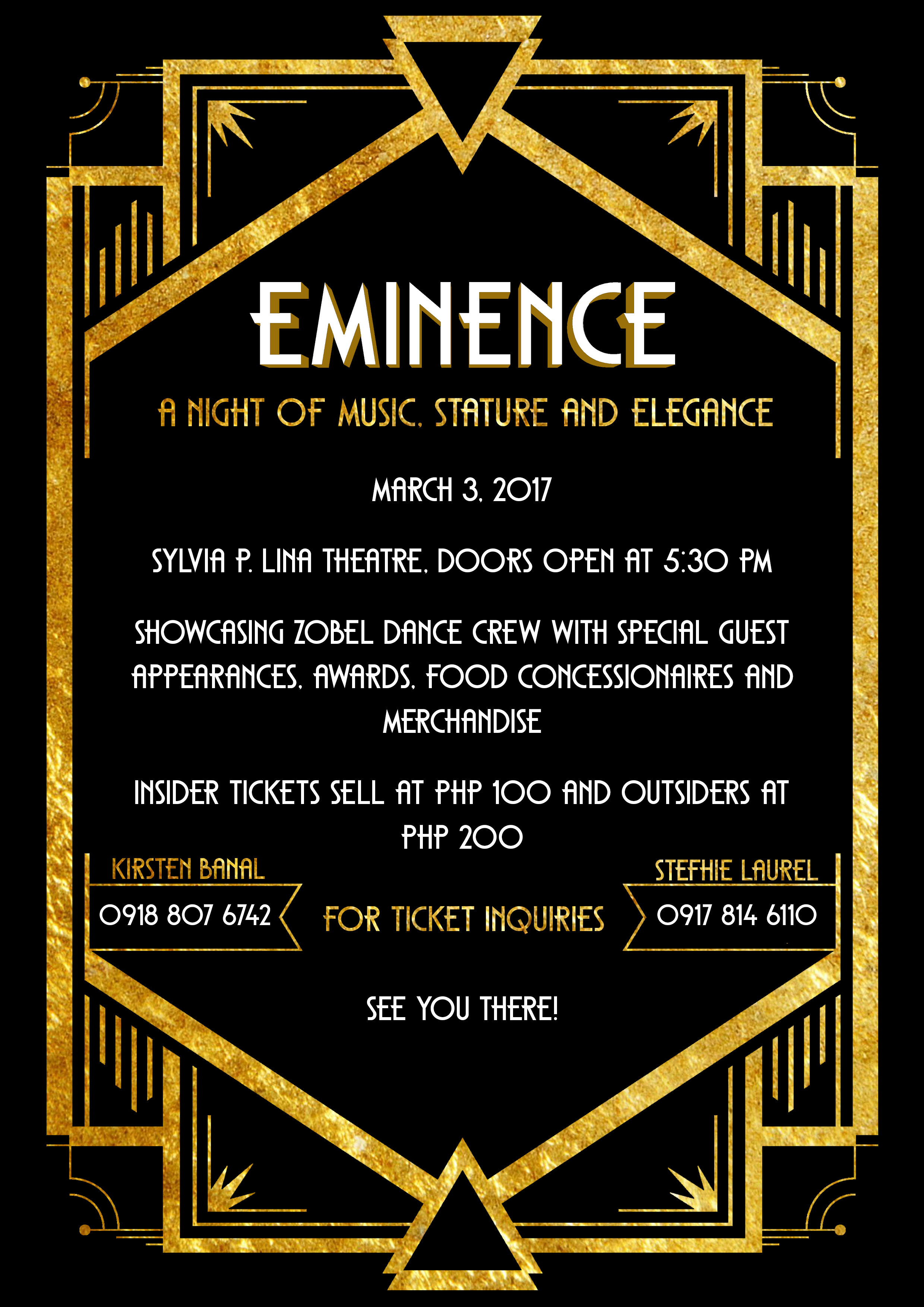 The De La Salle Zobel Dance Crew, also known as ZDC of AY 2016-2017, with their moderators Mr. Mark Mendoza and Mr. Anthony Ulbora, invites the DLSZ Community, parents and guests to watch their year-end presentation, “EMINENCE”, on March 3, 2017 5:30 pm at the Sylvia P. Lina Theater, CPA.