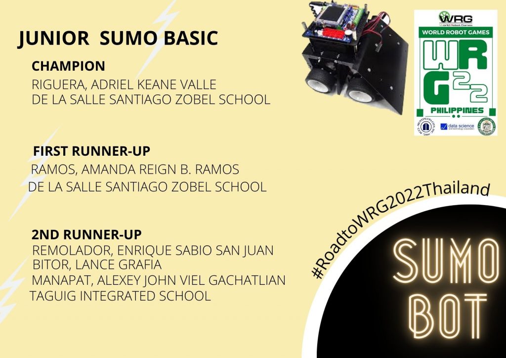 Congratulations to the DLSZ Robotics Elite Team and Mentors who bagged top awards in the Sumobot competition in the World Robot Games (WRG) 2022 Philippine Qualifying Games last July 23, 2022, held at the DLSZ Vermosa Campus.