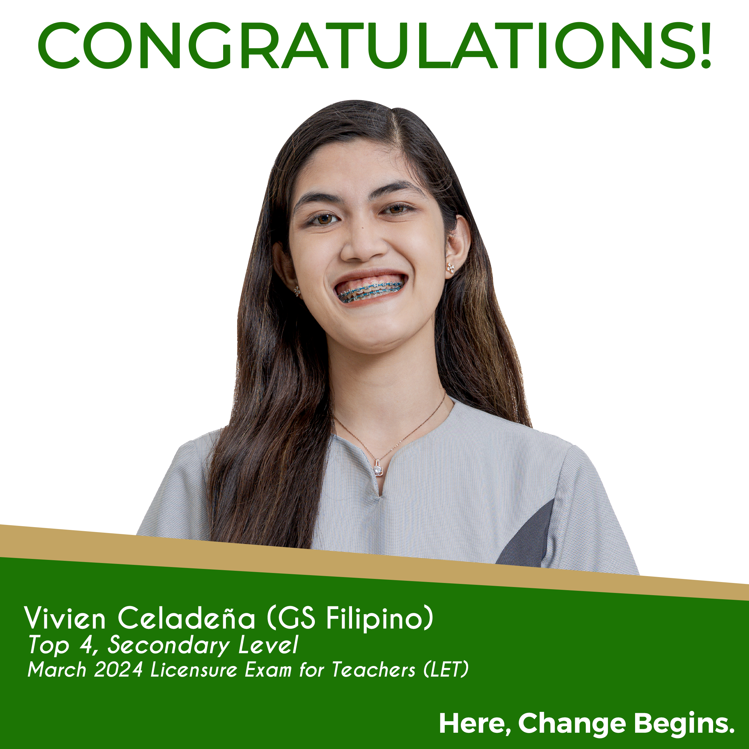 Congratulations to Ms. Kristine Patoc and Ms. Vivien Celadena for ranking 4th and 9th, respectively in the Secondary Level Licensure Exam for Teachers (LET) held last March 2024.
