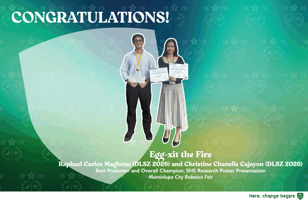Out of eight (8) teams that joined from the National Capital Region (NCR), the DLSZ team, represented by Raphael Carlos Maglutac (DLSZ 2026) and Christine Chanelle De Lemos Cajayon (DLSZ 2026), was also recognized for their exceptional communication skills, receiving the Best Presenter award for the compelling delivery of their research study entitled, “Developing an Eggshell-Derived Fire Suppressant: A Sustainable Approach to Fire Extinguisher Innovation.”