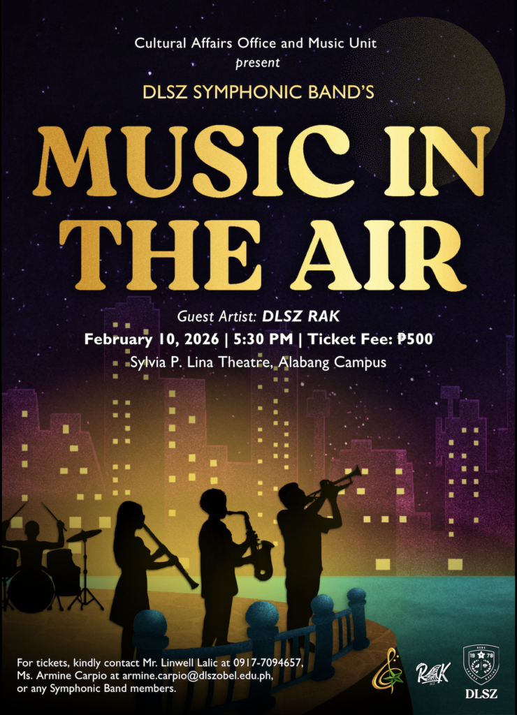 DLSZ Symphonic Band’s “Music in the Air” will feature James Swearingen’s Seagate Overture, OPM singles by Earl Agustin and Cup of Joe, a medley by the Jackson 5, and many more. DLSZ RAK will also perform as a guest artist, collaborating with the group on a medley of songs by Queen.