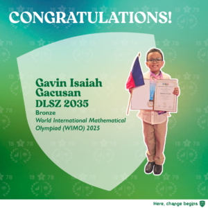 Congratulations to Gavin Isaiah Gacusan (DLSZ 2035) for winning the Bronze Award at the World International Mathematical Olympiad (WIMO) 2025, held on January 2–5, 2026, at The University of Hong